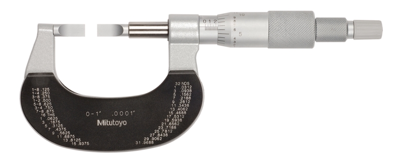 Микрометр лезвийный МКЛ- 1″ 0,001″ (0-1″) (тип лезвий A) 122-125 Mitutoyo — узкоспециализированный инструмент, применяемый для измерения диаметров наружных канавок. Этот тип микрометра более удобен по сравнению с гладким микрометром, так как специализированные лезвийные наконечники обеспечивают более сильное удельное давление на измеряемые поверхности. Прибор имеет механический тип работы, все показания снимаются вручную со стебля и барабана с нониусом. Инстрмент выполнен из качественных материалов, наконечники изготовлены из долговечных твердосплавных материалов и тщательно отшлифованы, скоба имеет теплоизолирующие накладки.